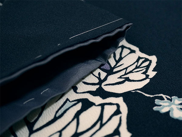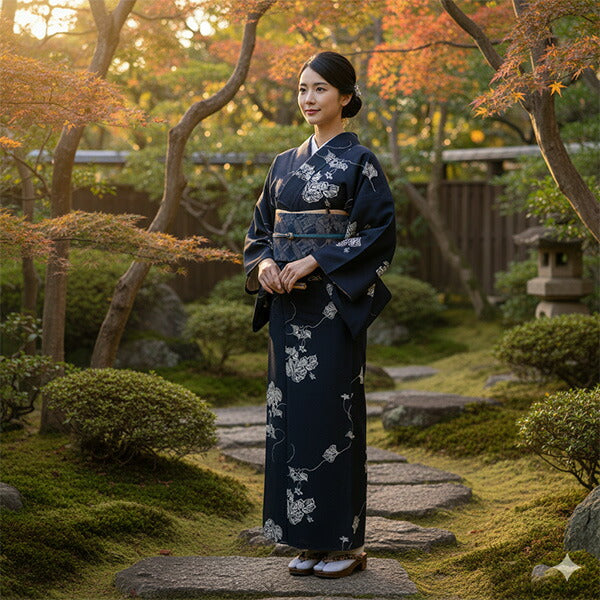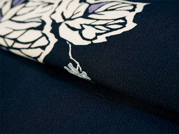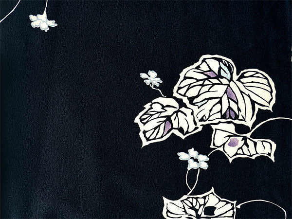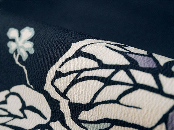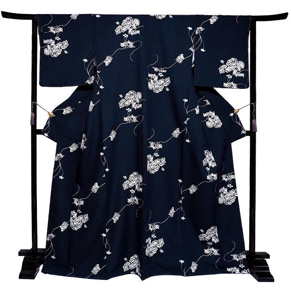 少し緑がかった濃紺の地に、切り絵のようなレトロ可愛い蔦柄が描かれています。大きな葉と細い蔓、小さな水色の小花が程よくリズミカルな柄感で、お洒落な小紋です。 生地はテイジン素材の縮緬地で、高級感があります。 八掛の色:グレー ※画像と柄の出方が異なる場合がございます。予めご了承くださいませ。 ※着用画像はAIによるイメージ画像です。 |