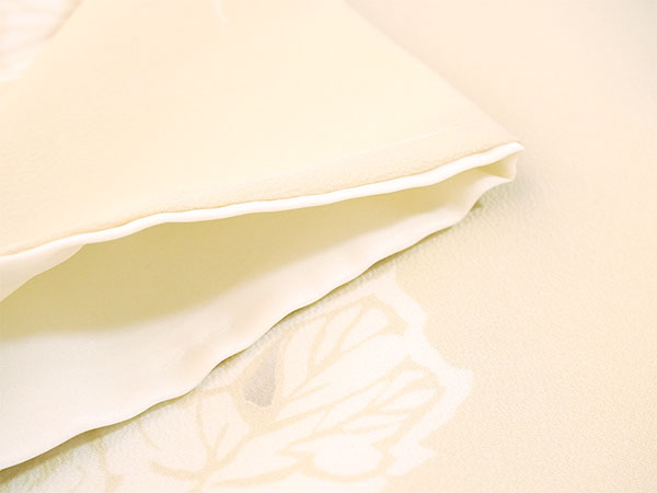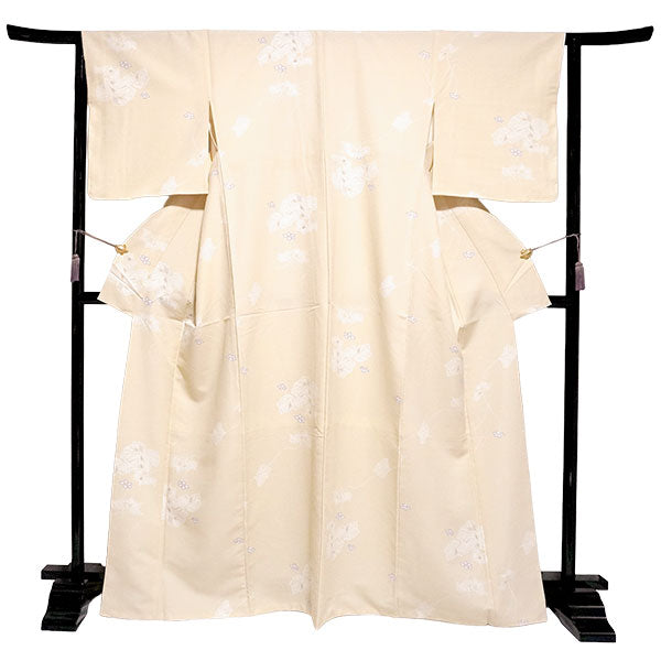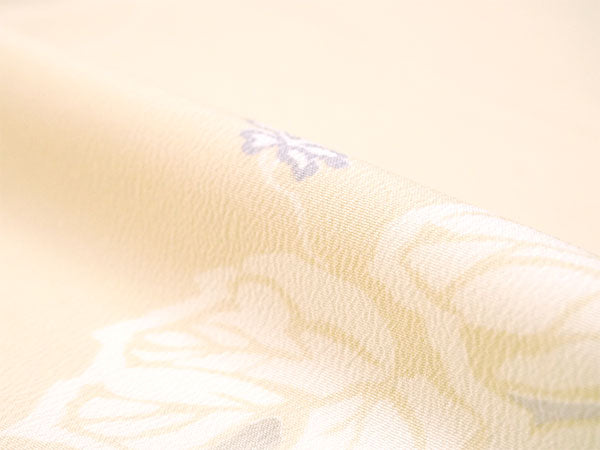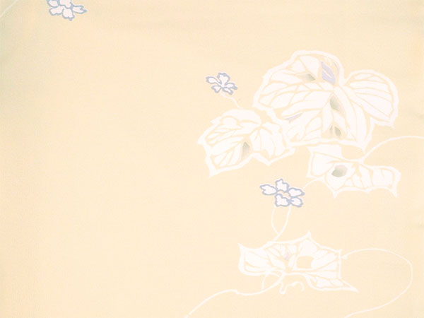 淡いクリームイエローの地に、さりげない白色で切り絵のようなレトロな蔦柄が描かれています。青の小花がチラリと散って、シンプルで可愛らしい柄ゆきです。 生地はテイジン素材の縮緬地で、高級感があります。 八掛の色:オフホワイト ※画像と柄の出方が異なる場合がございます。予めご了承くださいませ。 ※着用画像はAIによるイメージ画像です。 |