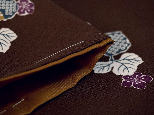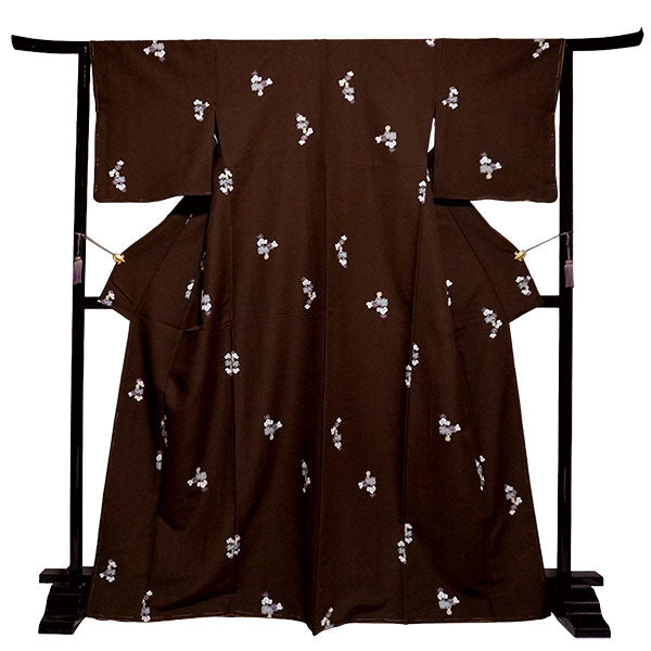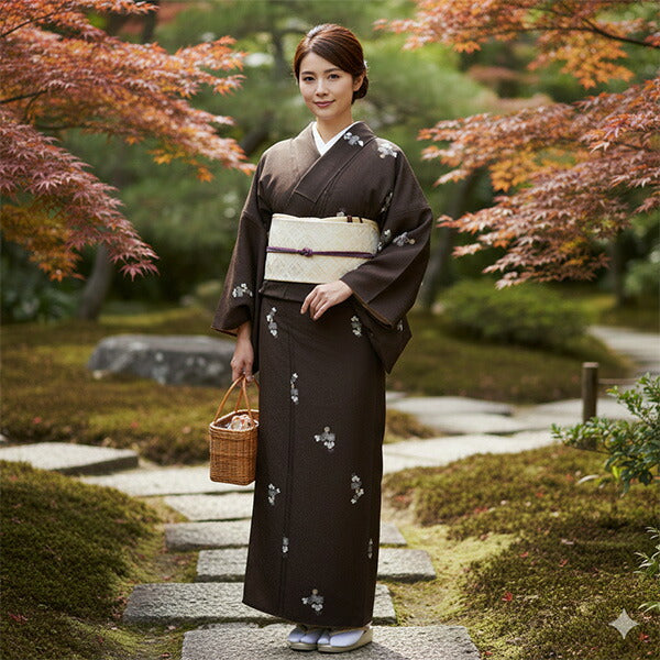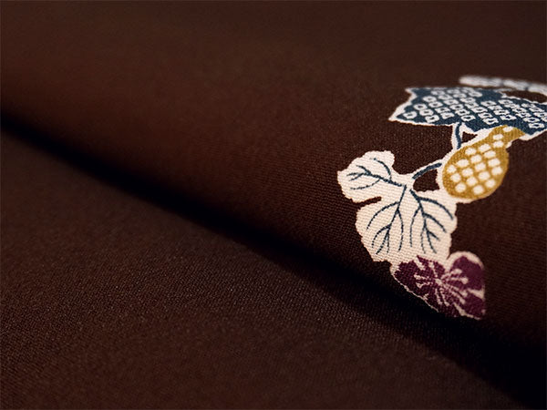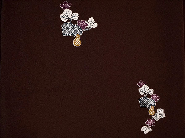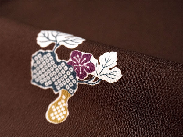 焦げ茶色の地に、素朴で可愛らしい瓢箪が飛び柄で描かれています。落ち着いて大人っぽく、どこか温かみのある雰囲気です。 生地はテイジン素材の縮緬地で、高級感があります。 八掛の色:金茶色 ※画像と柄の出方が異なる場合がございます。予めご了承くださいませ。 ※着用画像はAIによるイメージ画像です。 |
