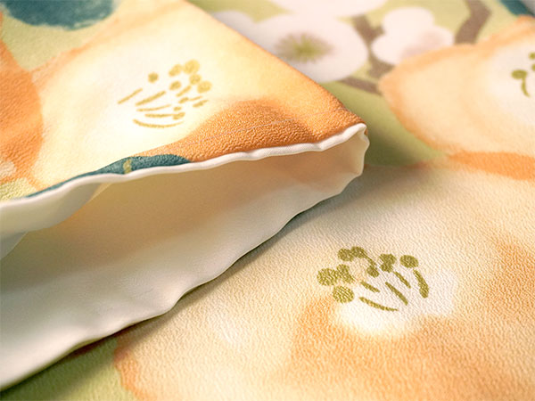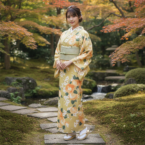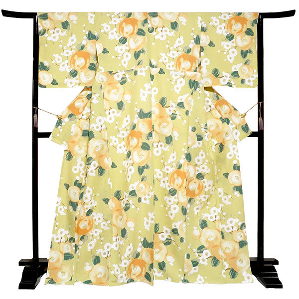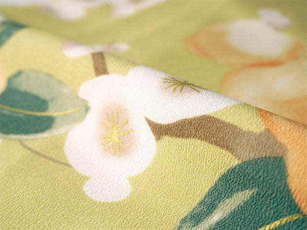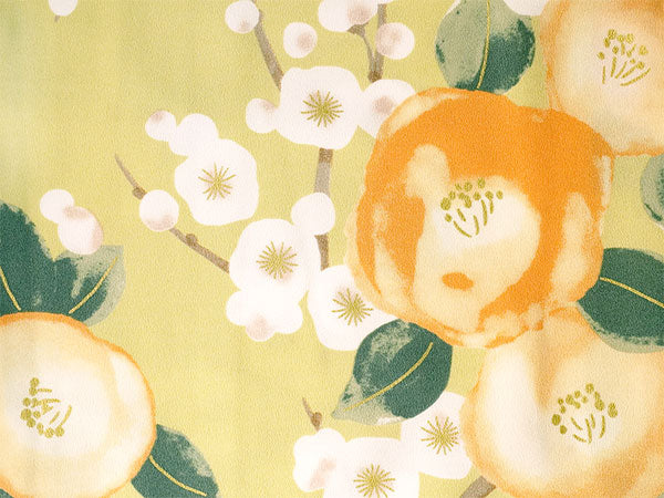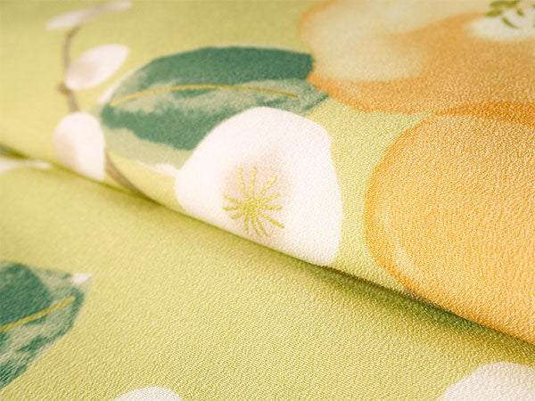 明るい黄緑の地に、ほわりとしたオレンジの椿と白の梅がおおらかに描かれています。明るく柔らで、瑞々しい若々しさのある雰囲気です。 生地は縮緬地で、高級感があります。 八掛の色:オフホワイト ※画像と柄の出方が異なる場合がございます。予めご了承くださいませ。 ※着用画像はAIによるイメージ画像です。 |