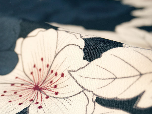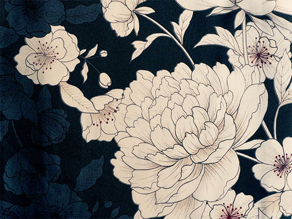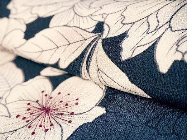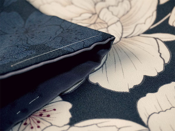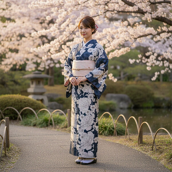 濃紺の地に、落ち着いた白で大輪の牡丹と桜が描かれています。シックな雰囲気にほんのりした濃淡と赤みが柔らかさを添え、使いやすく落ち着いた色味ながら華やかな柄ゆきです。 生地は縮緬地で、高級感があります。 八掛の色:グレー ※画像と柄の出方が異なる場合がございます。予めご了承くださいませ。 ※着用画像はAIによるイメージ画像です。 |