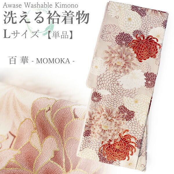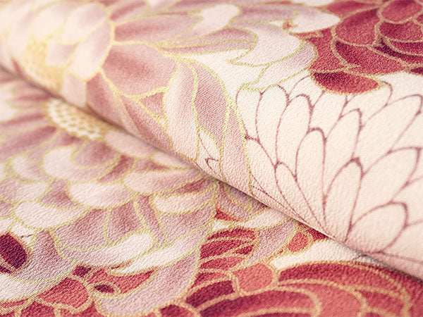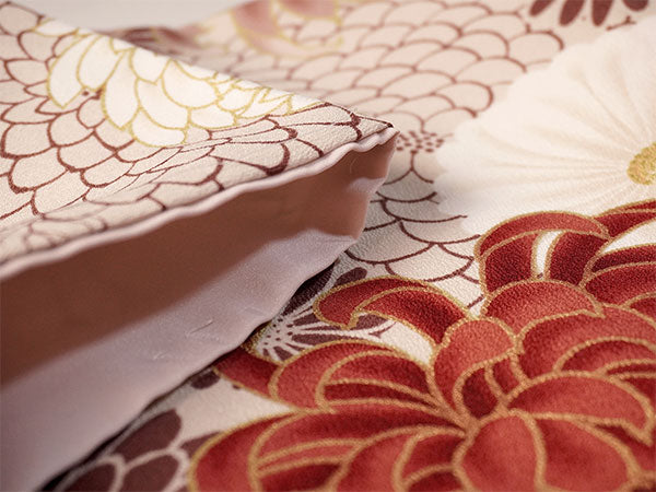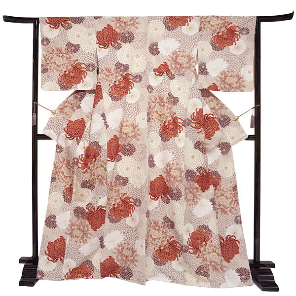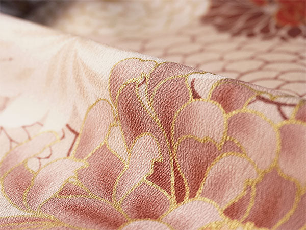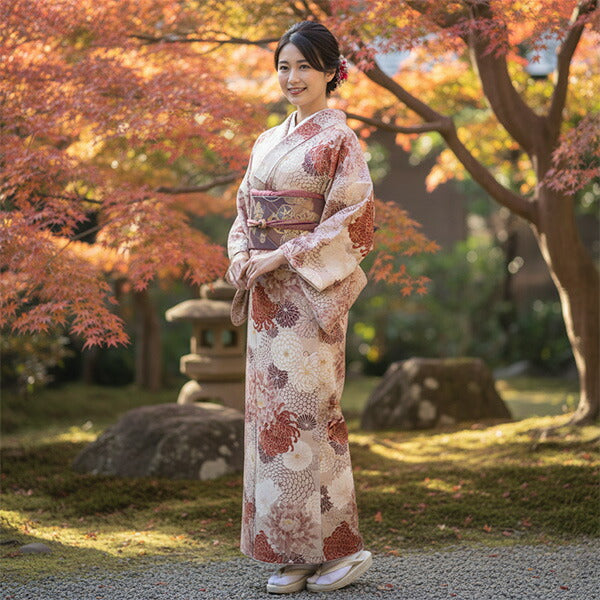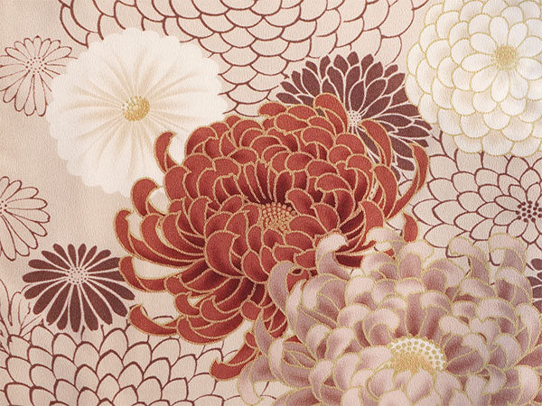 ベージュ地に表情豊かな大輪の菊が埋め尽くされています。深い赤や柔らかな白のコントラストが若々しく、金彩の縁取りも相まって落ち着いた色味ながら豪奢で華やかな雰囲気です。 生地は縮緬地で、高級感があります。 八掛の色:淡いくすみピンク ※画像と柄の出方が異なる場合がございます。予めご了承くださいませ。 ※着用画像はAIによるイメージ画像です。 |