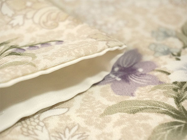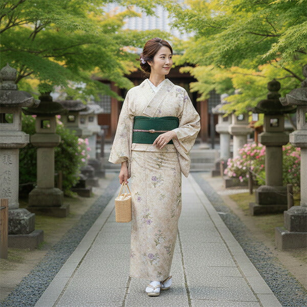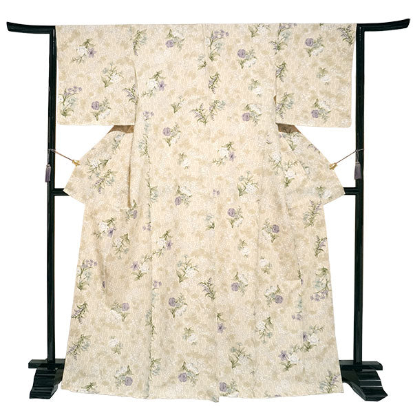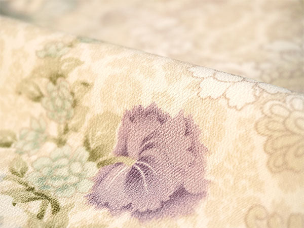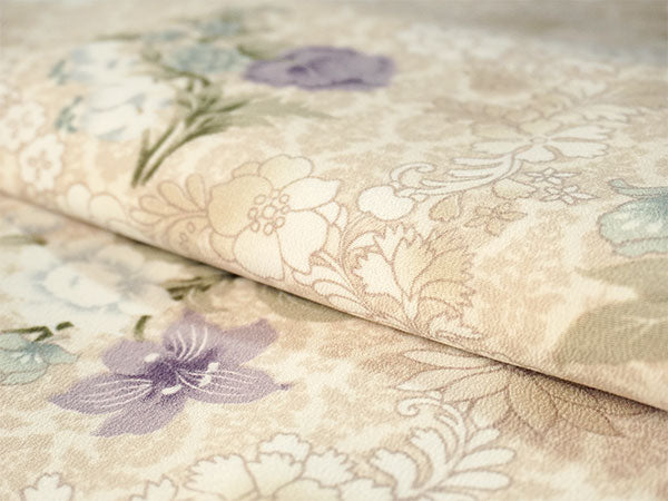 ベージュのエキゾチックな柄の地に、同色の更紗模様が描かれ、さらに青や紫の百合・蘭・撫子などが華やかに散らされています。少しレトロで大人っぽい雰囲気です。 生地は縮緬地で、高級感があります。 八掛の色:オフホワイト ※画像と柄の出方が異なる場合がございます。予めご了承くださいませ。 ※着用画像はAIによるイメージ画像です。 |