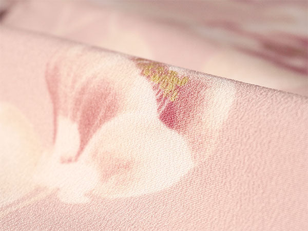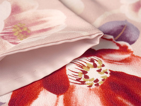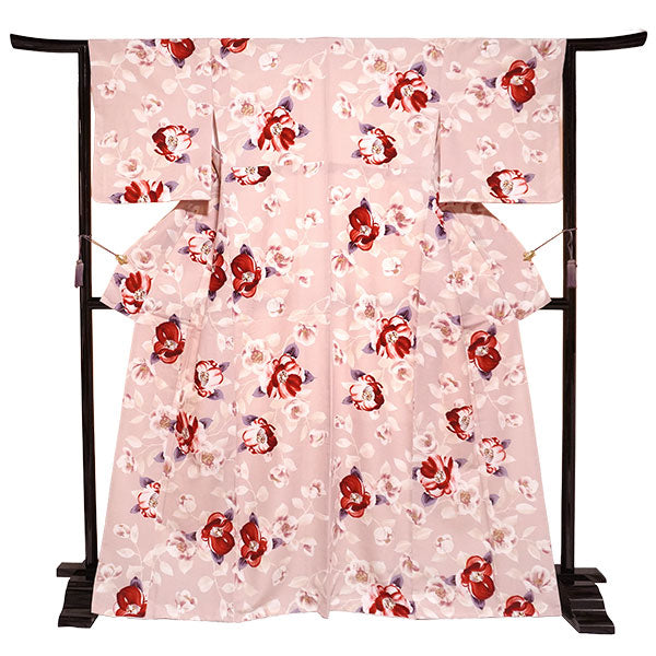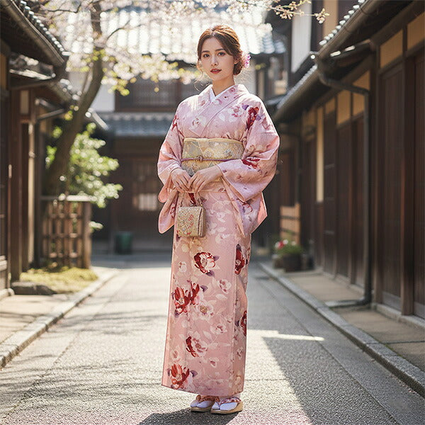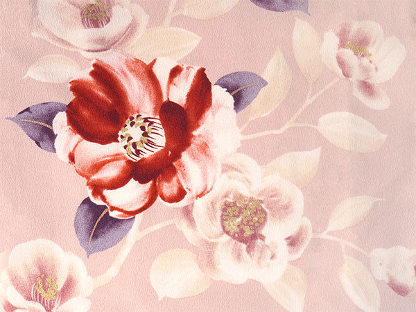 落ち着いた薄ピンクの地に、艶やかな椿が大きく散りばめられています。大胆に差された深い紅色は躍動感たっぷりで、ところどころの金彩がきらりと華やかな雰囲気です。 生地は縮緬地で、高級感があります。 八掛の色:薄渋ピンク ※画像と柄の出方が異なる場合がございます。予めご了承くださいませ。 ※着用画像はAIによるイメージ画像です。 |