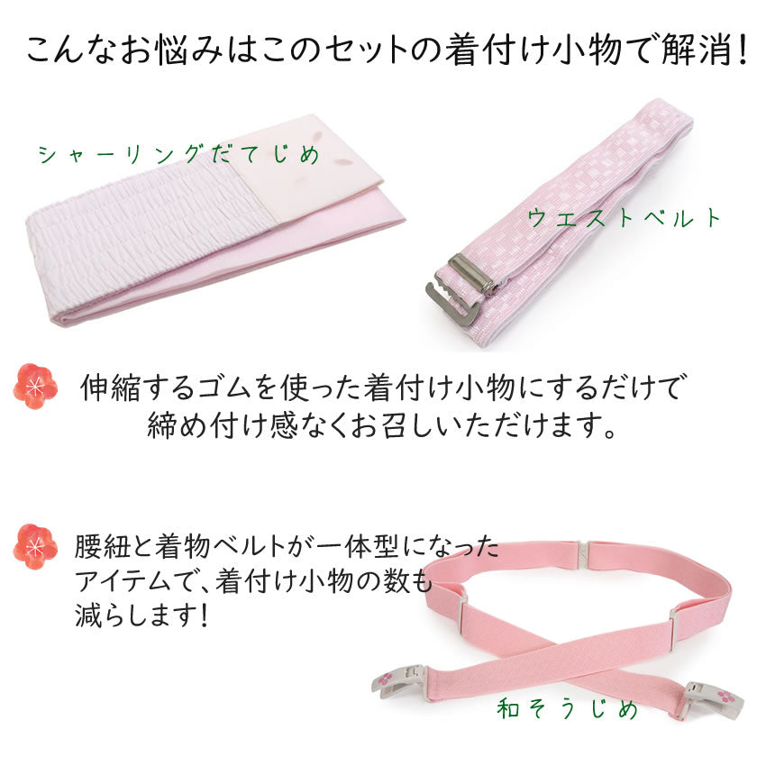 紐を使わない着付け小物で締め付け感なく、お着物をお召しいただけて、