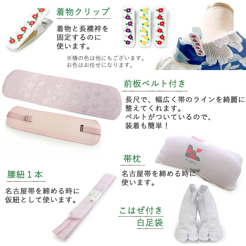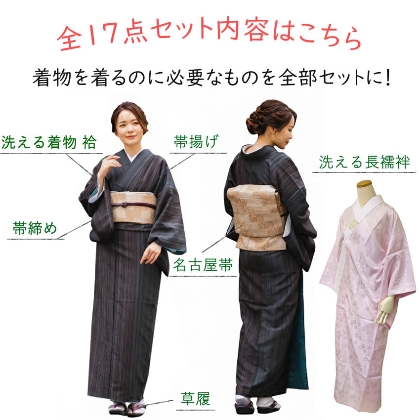 | 洗える着物・洗える名古屋帯・正絹帯揚げ帯締め・洗える長襦袢 着付け小物セット(着物スリップ・衿芯・足袋・前板・帯枕・コーリン和装締め2個・シャーリング伊達締め・腰紐1本・着物クリップ)・草履 |