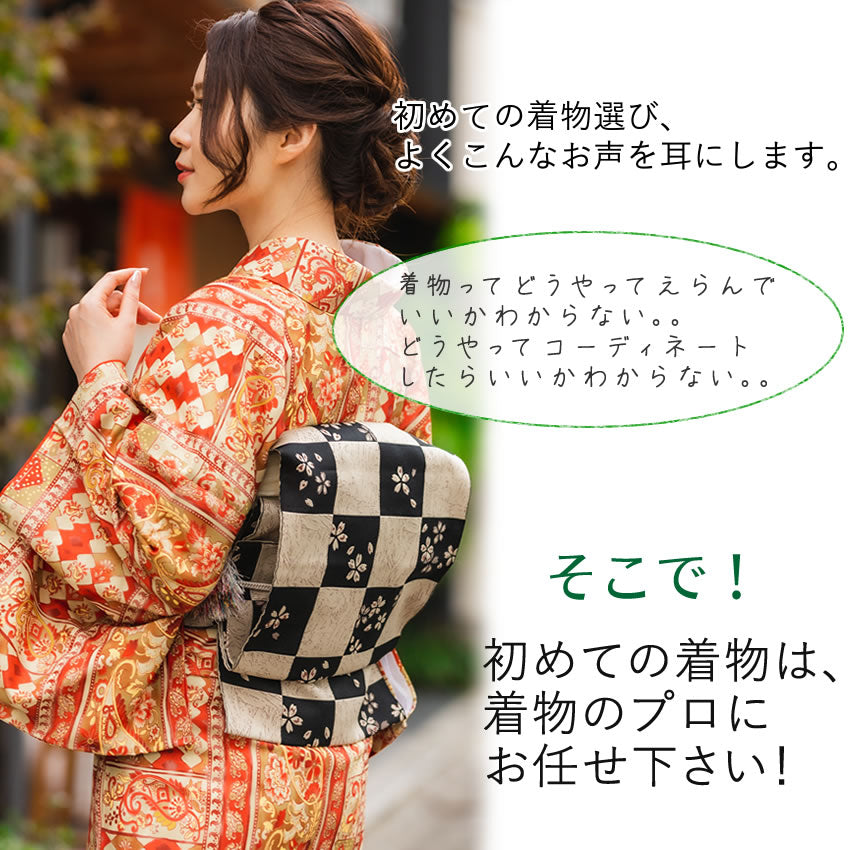 | はじめての着物選びはどうしたらいいかわからない。 そんなお声にお応えします! 着物のコーディネートは着物のプロにお任せください。 ご年代・ご希望の雰囲気・ご希望の着物の地色に応じてコーディネートさせて頂きます。 |