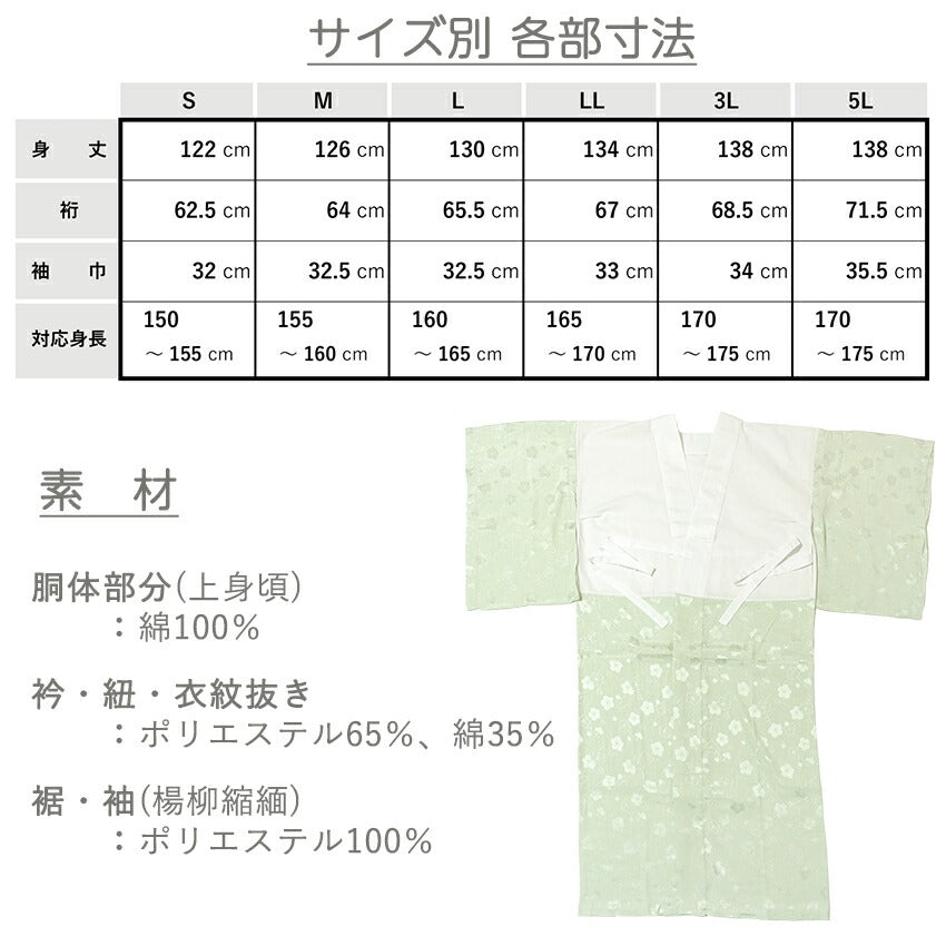 | 【身 頃】 胴体部分(晒):綿100% 地衿・衣紋抜き・紐:T/C(ポリエステル65%、綿35%) 衿芯:T/C厚め(ポリエステル65%、綿35%) 【裾・袖】 楊柳:ポリエステル100% |