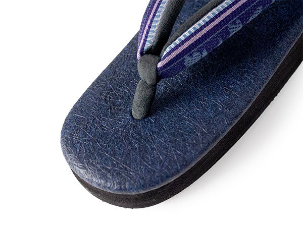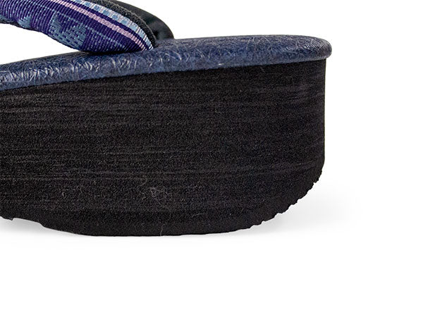 台:ネイビー(天)、ブラック(巻) 鼻緒上:紺地更紗に縞柄(博多織) 鼻緒下:ダークグレー ※裁断の場所によって、柄の出方が異なります。あらかじめご了承くださいませ。 |