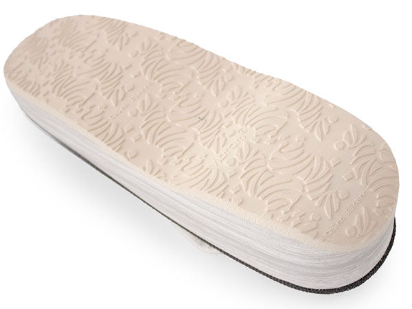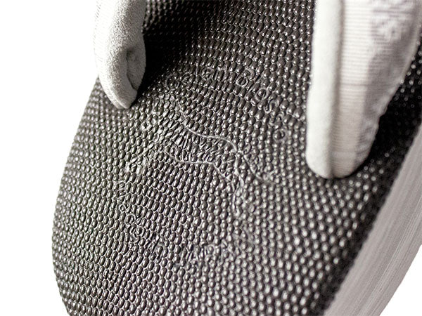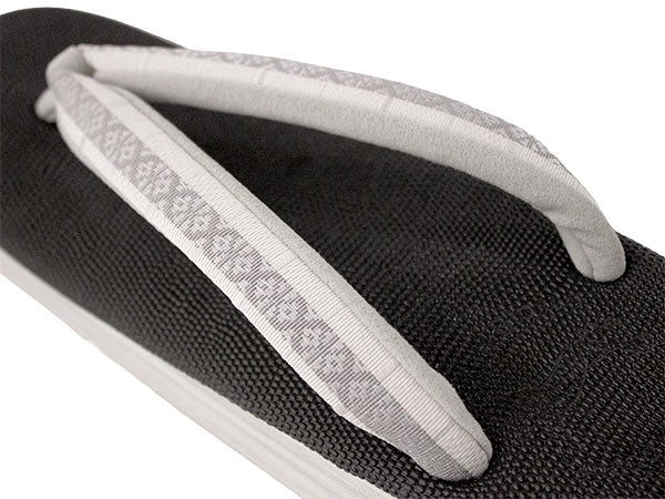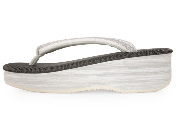 台:エンボス調チャコールグレー(天)、ライトグレー(巻) 鼻緒上:白地に灰色の花皿柄(博多織) 鼻緒下:ライトグレー ※裁断の場所によって、柄の出方が異なります。あらかじめご了承くださいませ。 |