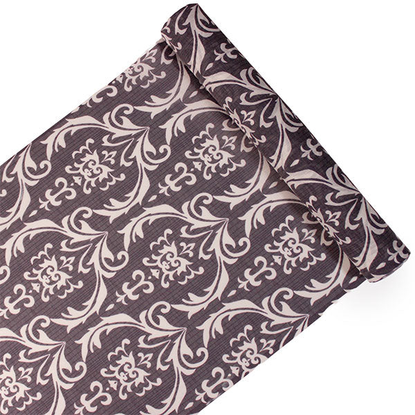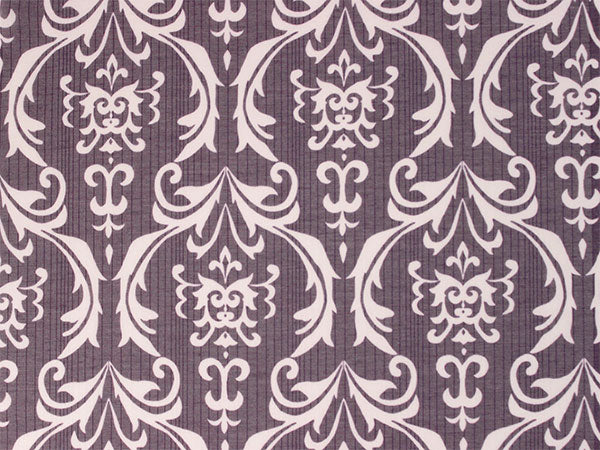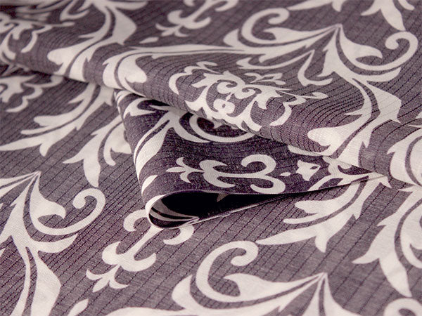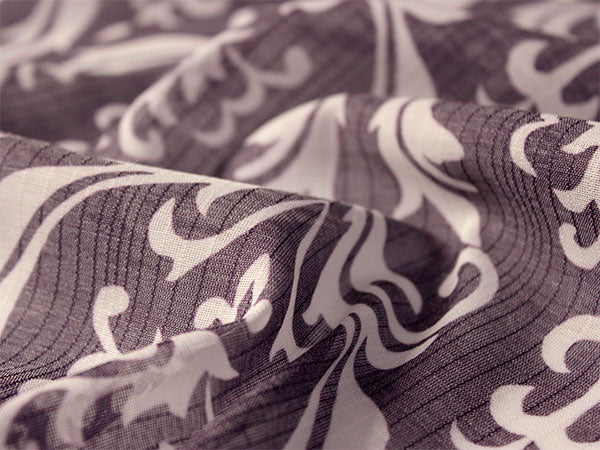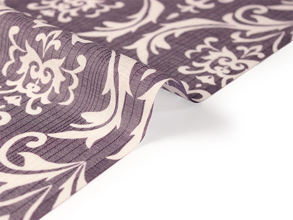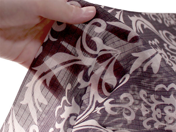 濃い渋紫の地に白で、装飾的なダマスク柄が大きく大胆にデザインされています。くっきりしたコントラストが目を惹く柄の長襦袢です。 【紗】 透け感のある紗の生地で、滝縞のようなストライプが入っています。柔らかい手触りです。 |
