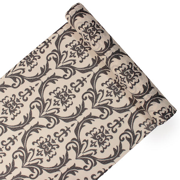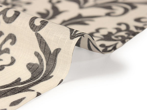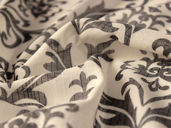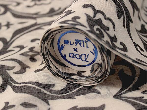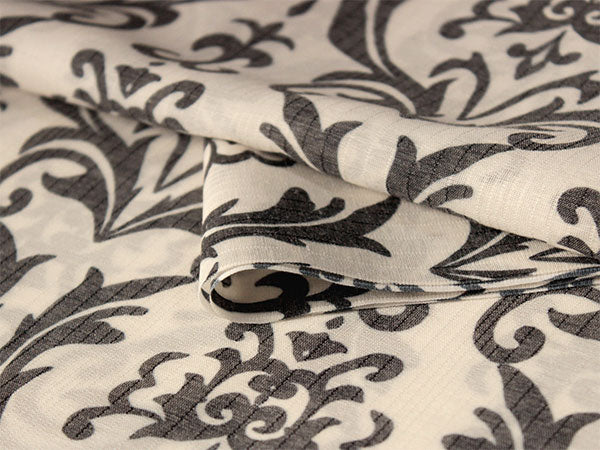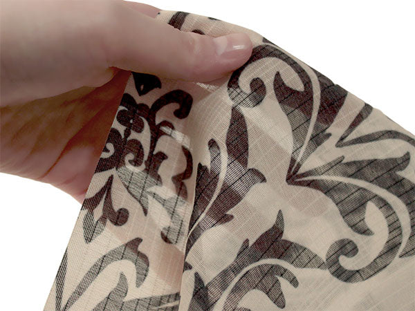生成色の地に黒で、装飾的なダマスク柄が大きく大胆にデザインされています。くっきりしたコントラストが目を惹く柄の長襦袢です。 【紗】 透け感のある紗の生地で、滝縞のようなストライプが入っています。柔らかい手触りです。 |