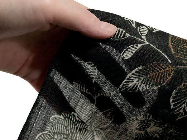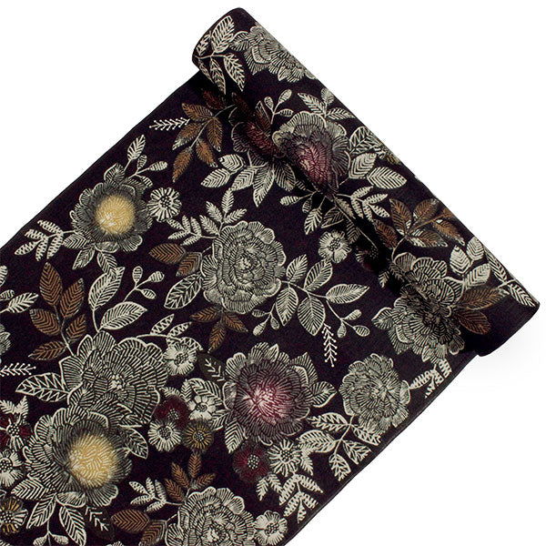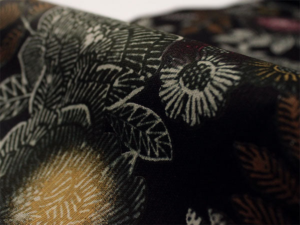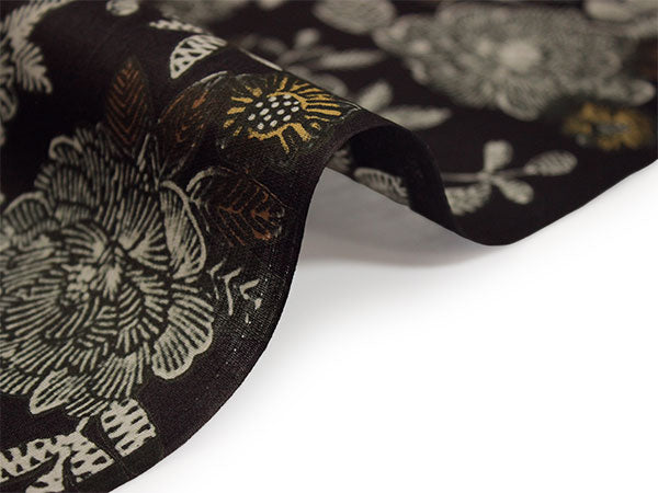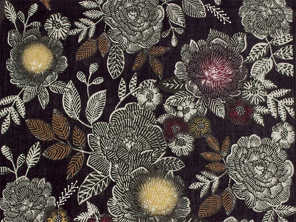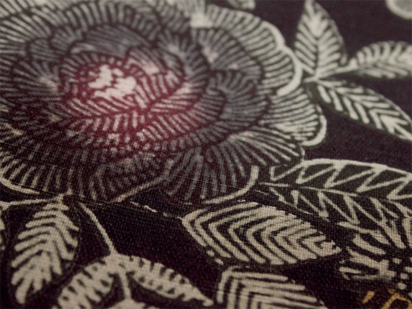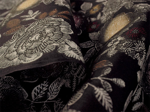 少し褪せ感のある黒の地に、バラや牡丹を思わせる豪奢な花がクラシカルなペン画のように描かれています。 シックで華やかなコントラストが魅力的な柄ゆきです。 |