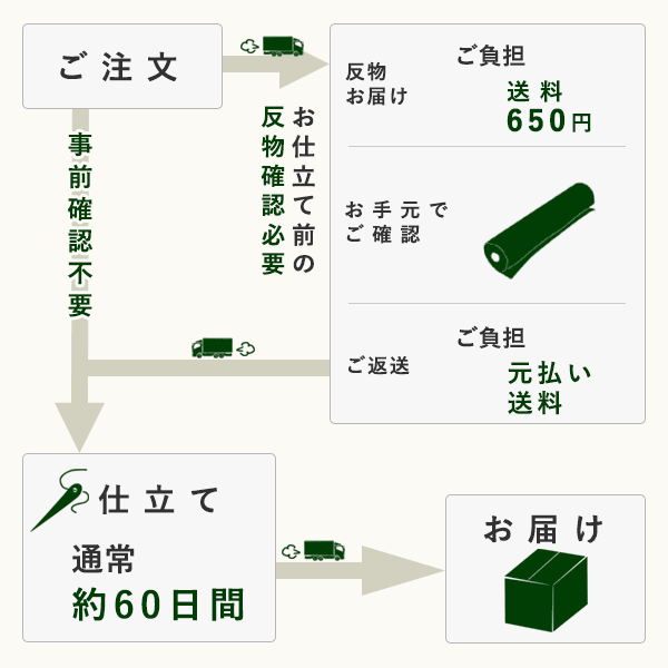 | ※ご希望であれば、往復の送料をご負担いただく形でお仕立て前のお品を事前にご確認頂けます。ご希望の方はご購入の際に備考欄へ【仕立て前の反物確認希望】とご記入ください。 またご確認いただきましたお品は、元払い にてご返送下さい。 |